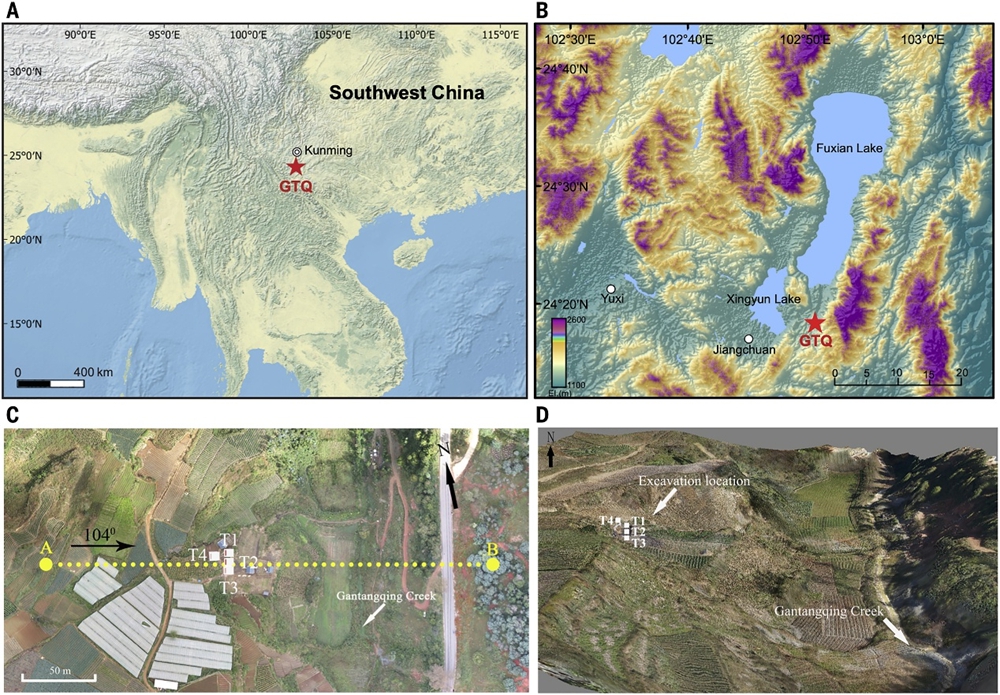 圖1.甘棠箐遺址(GTQ)位置。(A)東南亞區(qū)域地圖,顯示了遺址及云南省會(huì)城市昆明市的位置。(B)數(shù)字高程地圖,標(biāo)示了甘棠箐遺址、撫仙湖、玉溪市和江川區(qū)以及周邊地區(qū)。(C)遺址區(qū)域航拍圖,展示了遺址周邊及發(fā)掘探方(T1 ~T4)的位置。此圖中的 A — B 線對應(yīng)于圖 2A 中的沉積剖面。(D)三維(3D)模型展示了遺址的地形地貌以及 T1 ~T4 探方的位置。