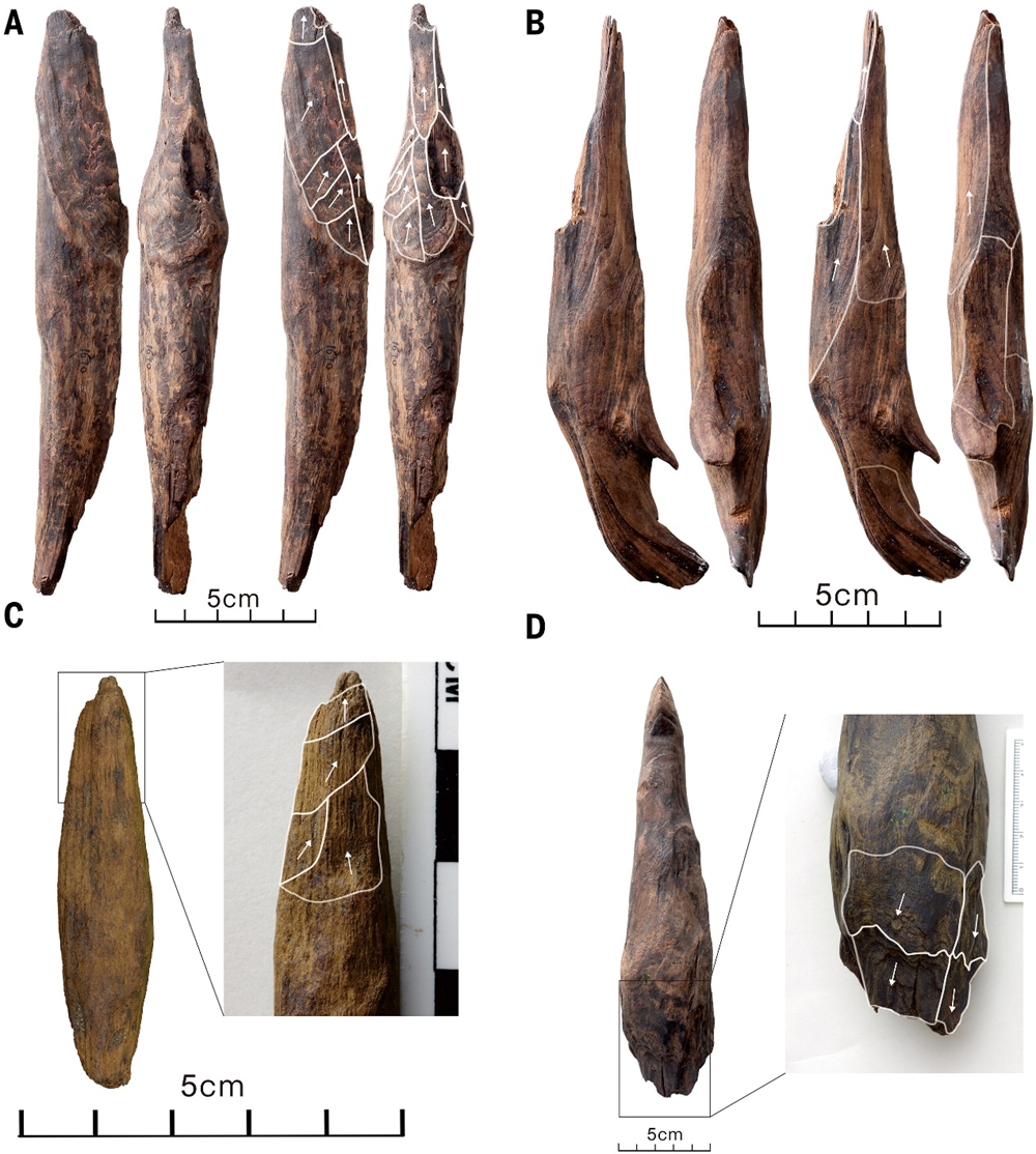 ?圖2.木器加工示意圖。(A)T2 - 1670。(B)T1 - 1898。(C)T4 - 193。(D)T2 - 1674。箭頭指示修削方向;白線圈出的位置為修削疤痕,因使用磨損或保存不佳導(dǎo)致邊界不太清晰。
