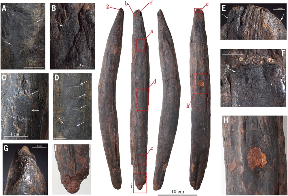 遺址共出土近千件木質(zhì)材料,通過工具形態(tài)、加工及使用痕跡等的觀察分析,并與針對性模擬考古實(shí)驗(yàn)結(jié)果進(jìn)行對比研究,35件木質(zhì)遺存最終被確定為人工加工工具。這些木制工具大小不一,形態(tài)多樣,其尖部形態(tài)可分為鑿尖狀、鏟尖狀、錐尖狀、鉤狀和凸緣狀等。其中19件標(biāo)本保留明顯的削枝修型和加工使用端尖部留下的修削痕(圖2),17件尖端保存有因使用而產(chǎn)生的磨光、條紋、纖維折斷和木質(zhì)破損等痕跡(圖3),這些加工和使用痕跡出現(xiàn)在特定部位并具有方向性,且部分標(biāo)本尖部和器身還保存有沖填土壤和植物殘留物,是甘棠箐古人類加工與使用木器的確鑿證據(jù)。木器中有兩件需雙手持握的大型挖掘棒(digging stick;圖3),其形態(tài)與意大利Poggetti Vecchi遺址(約17.1萬年前)的出土標(biāo)本相似。另有四件型制獨(dú)特鉤狀工具,可能用于切斷植物根系;其余的標(biāo)本則為可單手持握的小型挖掘工具。相較于舊大陸西部遺址出土的大型木器(以狩獵工具為主),甘棠箐的木質(zhì)工具種類更豐富,尤以小型單手持握的木器為主,反映了生活在此地的古人類在木材選擇、功能性刃部預(yù)制方面具有前瞻性和計(jì)劃性,能根據(jù)不同的功能需求制作不同形態(tài)的工具。研究還揭示了在與歐洲和非洲不同的環(huán)境背景下,東亞古人類所具有獨(dú)特的適應(yīng)策略和生存方式。生活在甘棠箐的古人類在亞熱帶環(huán)境中以植物資源為重要食物對象,而在歐洲舍寧根等北溫帶環(huán)境中,對大型哺乳動(dòng)物的狩獵則明顯占據(jù)了主導(dǎo)地位。甘棠箐的木器組合顯示了有機(jī)材料作為舊石器時(shí)代加工人工制品的重要性,它們的制造技術(shù)與東亞和東南亞發(fā)現(xiàn)的石器明顯的“原始”性質(zhì)形成了鮮明的對比,木制工具可能在東亞中更新世古人類的生存和環(huán)境適應(yīng)中發(fā)揮了重要作用。