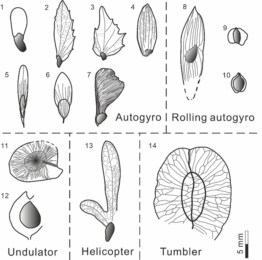 呂合和Kundratice化石點風傳種子和果實氣動類型劃分?1. Pinus sp.;2. Carpinus sp. 1;3. Carpinus sp. 2;4. Ostrya sp.;5. Fraxinus zlatkoi;6. Fraxinus?cf. honshuensis;7. Acer sp.;8. Ailanthus confucii;9. Betula sp.;10. Alnus kefersteinii;11. Dipteronia brownii;12. Ulmus sp.;13. Palaeocarya hispida;14. Craigia bronnii.