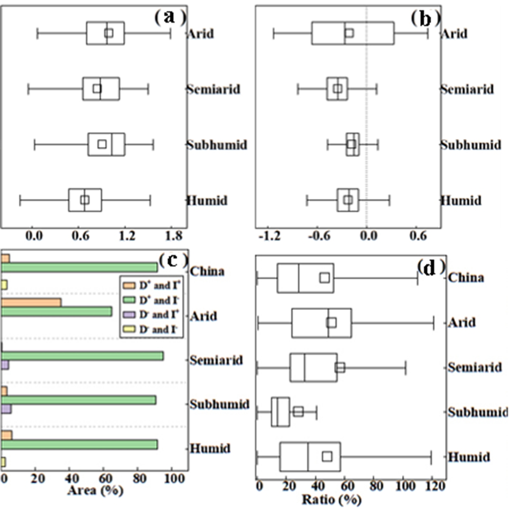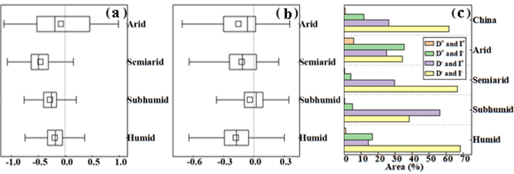 圖 2 大氣飽和水汽壓差對(duì)植被生產(chǎn)力影響的直接作用、間接作用及其交互作用