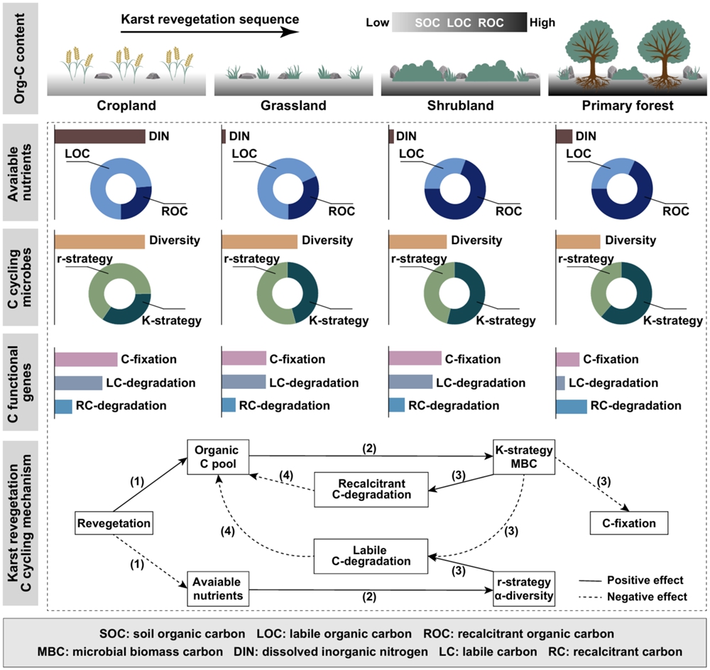 中國(guó)西南喀斯特地區(qū)是全球重要的碳匯功能區(qū),其獨(dú)特的生境條件和破碎化的生態(tài)系統(tǒng)結(jié)構(gòu),構(gòu)成了該區(qū)域生態(tài)系統(tǒng)脆弱性的基礎(chǔ)。同時(shí),近年來(lái)的持續(xù)氣候變化和社會(huì)經(jīng)濟(jì)的快速發(fā)展加劇了土壤侵蝕、水土流失、生物多樣性喪失等諸多問(wèn)題,進(jìn)一步凸顯了喀斯特生態(tài)系統(tǒng)的脆弱性。近年來(lái),針對(duì)喀斯特脆弱區(qū)的植被恢復(fù)工作受到廣泛關(guān)注。盡管已有研究證實(shí)植被恢復(fù)有助于提高土壤有機(jī)碳儲(chǔ)量和生物多樣性,但在恢復(fù)過(guò)程中,介導(dǎo)碳循環(huán)的微生物群落特征(如:多樣性、生活史策略、共生模式等)演變規(guī)律及其對(duì)土壤有機(jī)碳分解與穩(wěn)定的調(diào)控機(jī)制仍需進(jìn)一步探討。